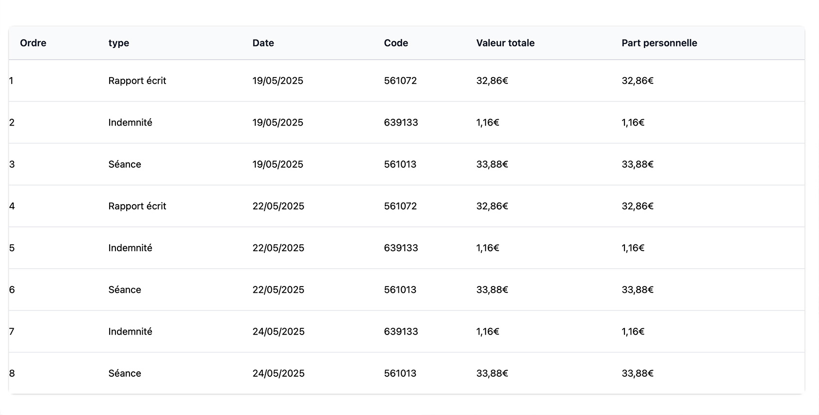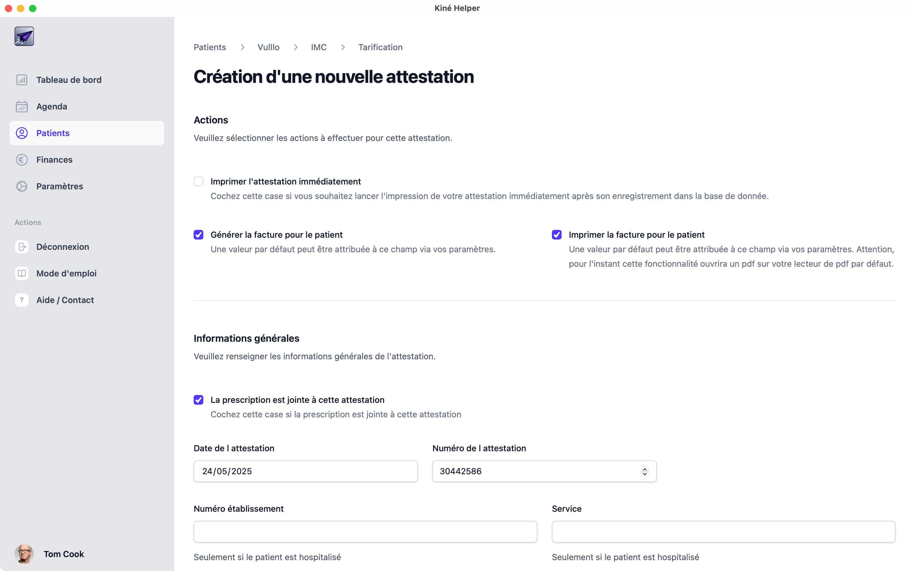 Lorsque vous produisez une attestation dans Kiné Helper, il assigne automatiquement les bons codes à vos séances et vous les montre.